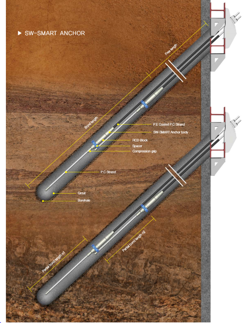 SW- Smart là một neo có cơ chế tạo ma sát kéo phân bố tải trọng thông minh, đảm bảo lực neo bằng cách phân phối đều xung quanh vữa bầu neo và đất nền được tạo ra trong toàn bộ chiều dài liên kết chứ không phải ma sát tập trung ở đầu trước của thân neo. Neo Smart cũng có thể tháo rời rút cáp bằng tay giống như neo RCD, nhưng được phát triển cho các công trình có điều kiện đất nền yếu (xấp xỉ N = 10).